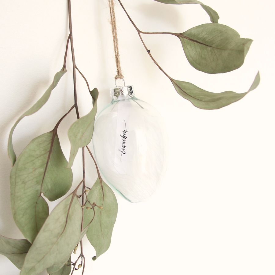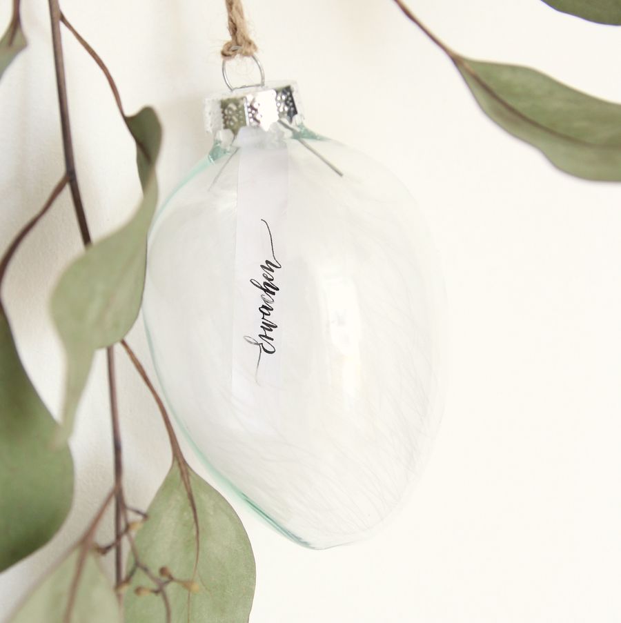 gefüllt mit einer weißen, flauschigen feder und einem kalligrafierten papierstreifen.
